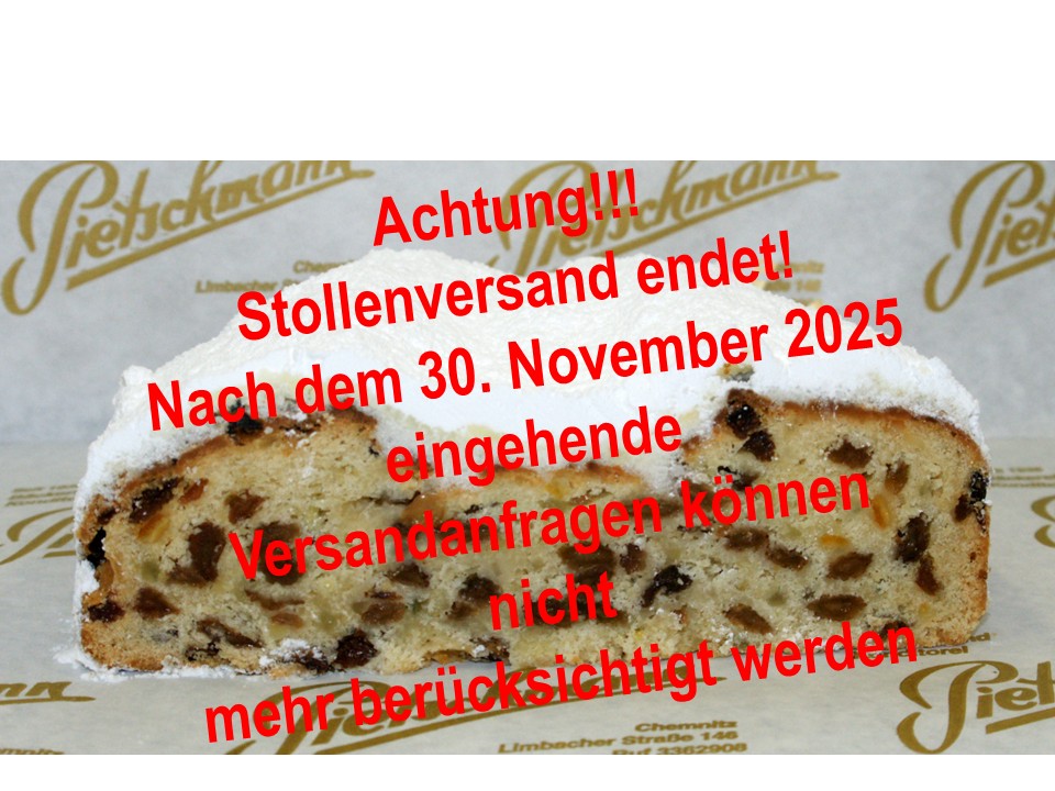 Aus personellen Gründen können keine weiteren Stollenbestellungen ab dem 30. November 2025 angenommen werden. Alle bis zu diesem Datum eingegangenen Anfragen werden noch bearbeitet – wir bitten um Ihr Verständnis.